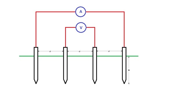 Electrodos de prueba: Se colocan cuatro electrodos a lo largo de una línea